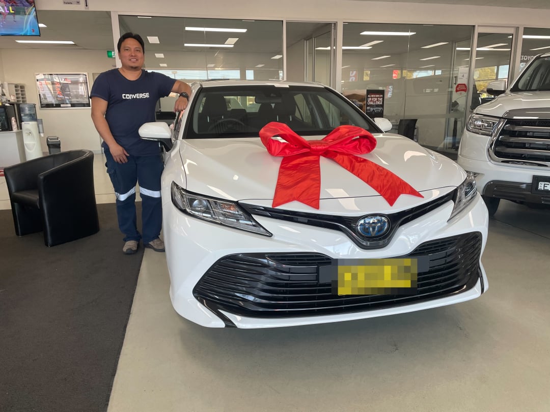 Picking up their new Toyota Camry Hybrid